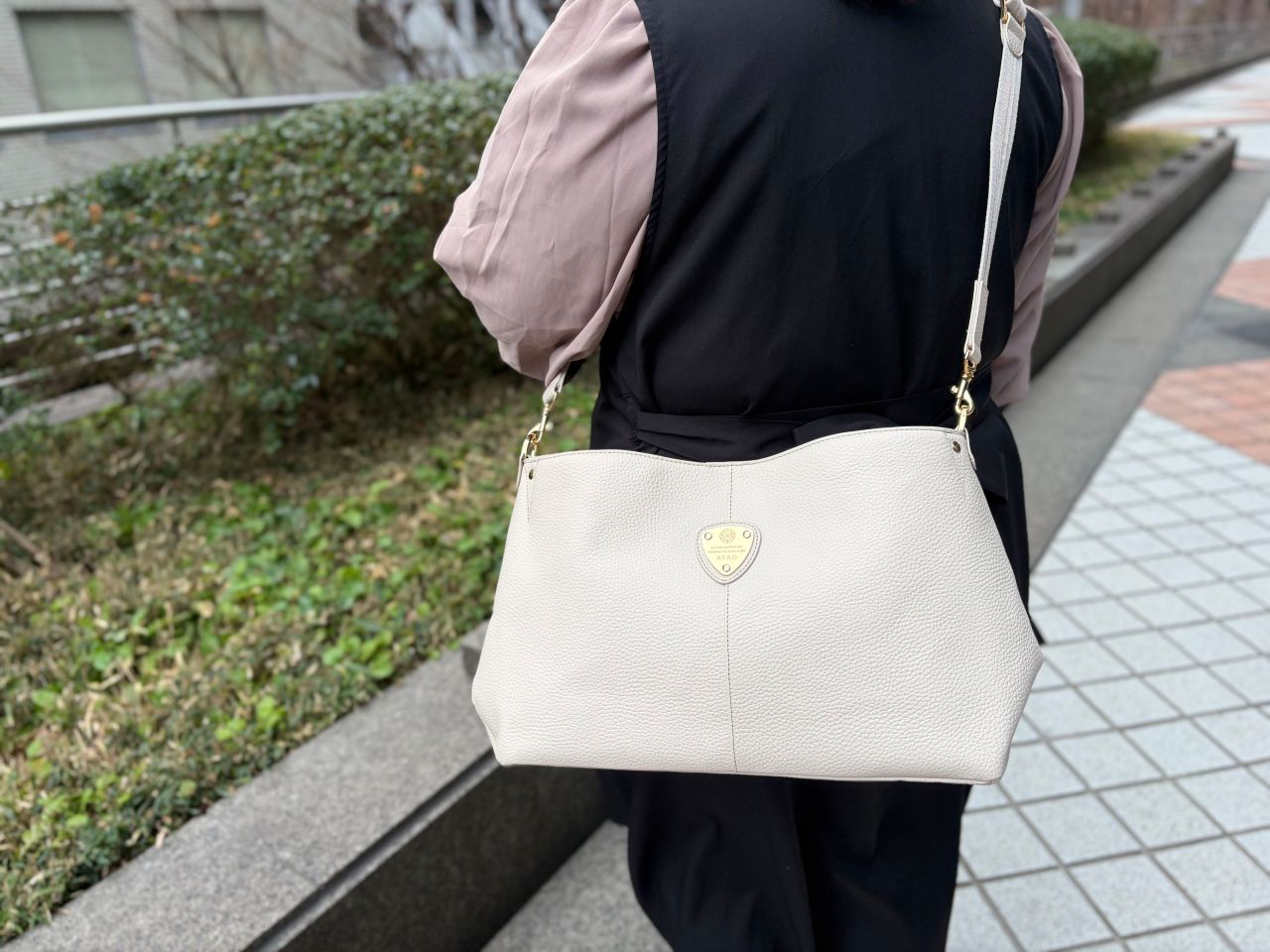 手持ちで持つとくったりと左右が中央に寄って、コンパクトなイメージになるelvy+ですが、A4を入れる時は持ち手を使わず付属のショルダー紐を使用します。