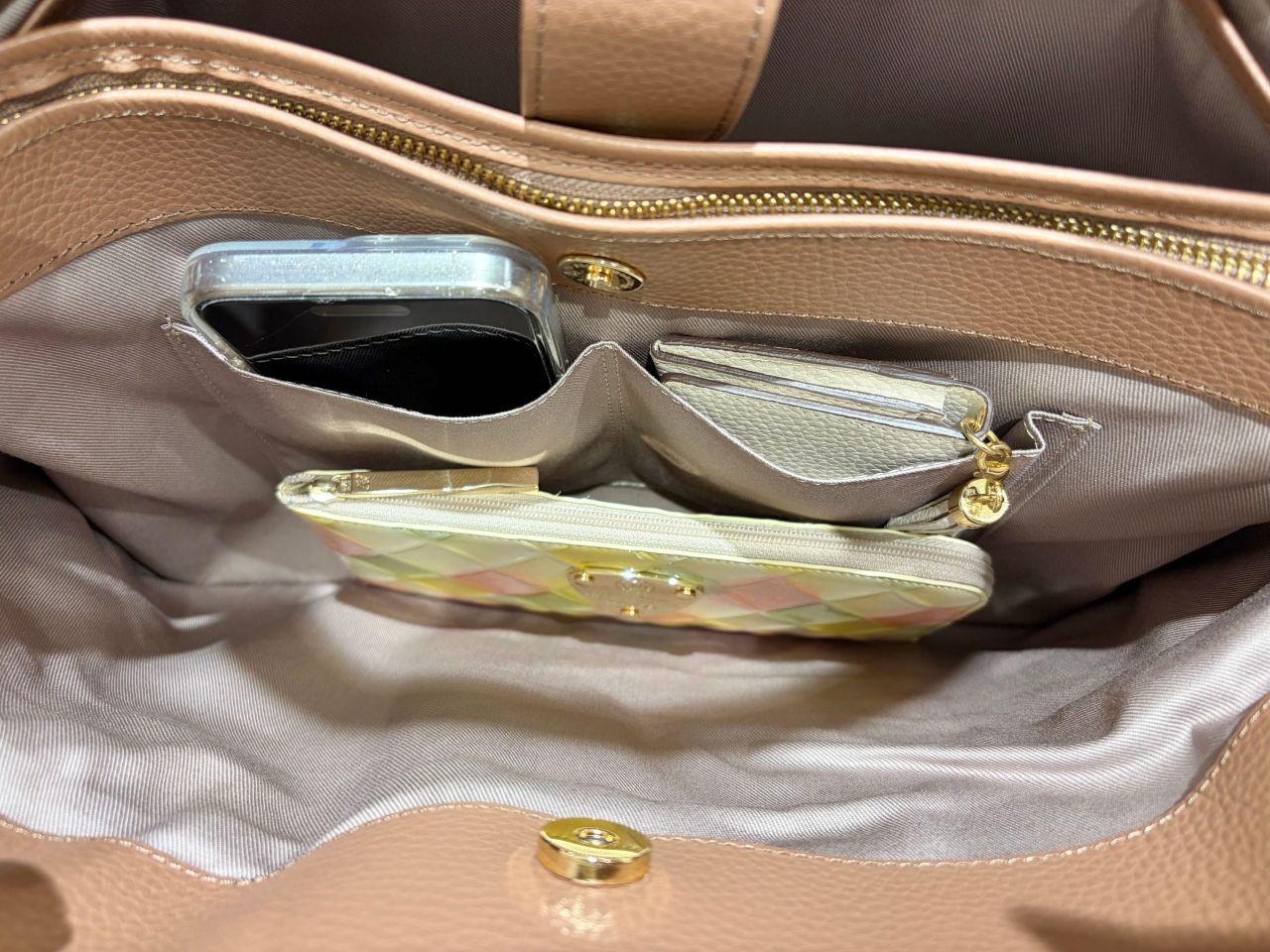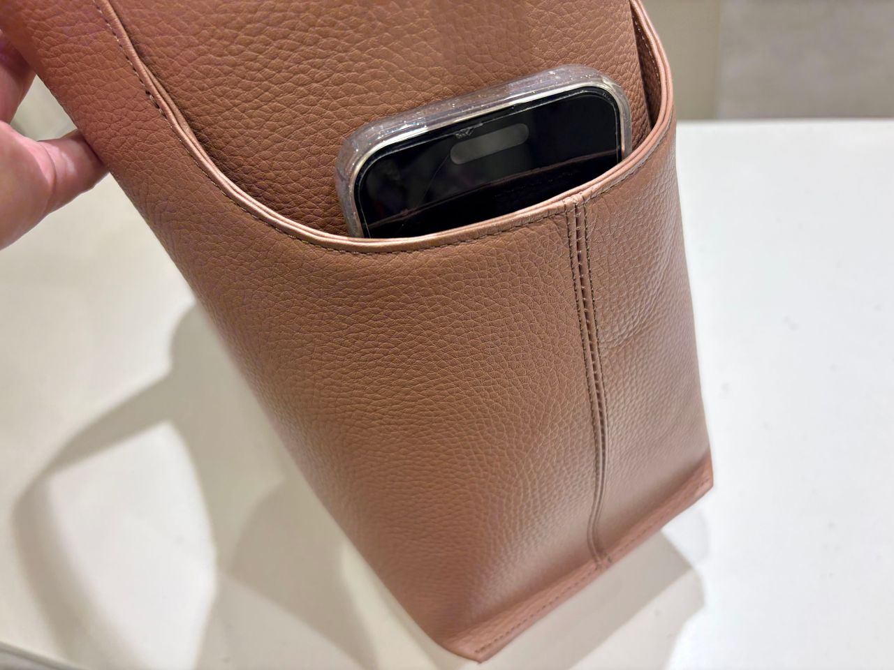小物ポケットは名刺入れやスマホを入れるのにも便利で、この通り長財布も余裕で入ります。