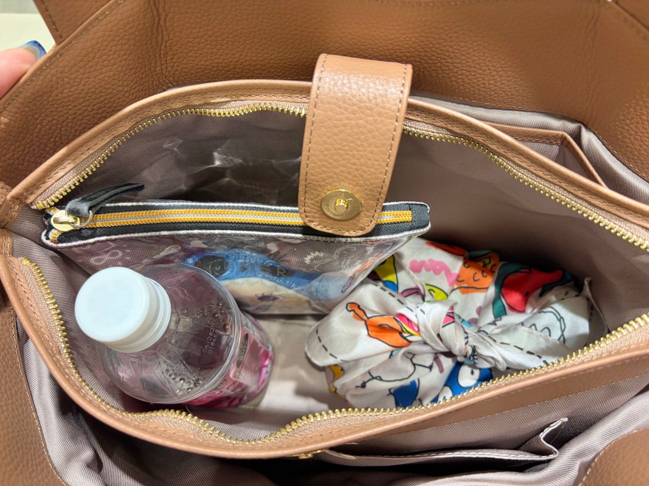 メインポケットのマチ幅は13㎝なので、ペットボトルは余裕で入り、ポーチやお弁当箱(16㎝×10㎝)も入りました。