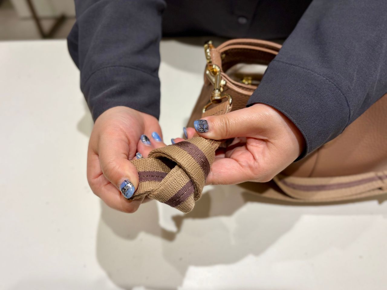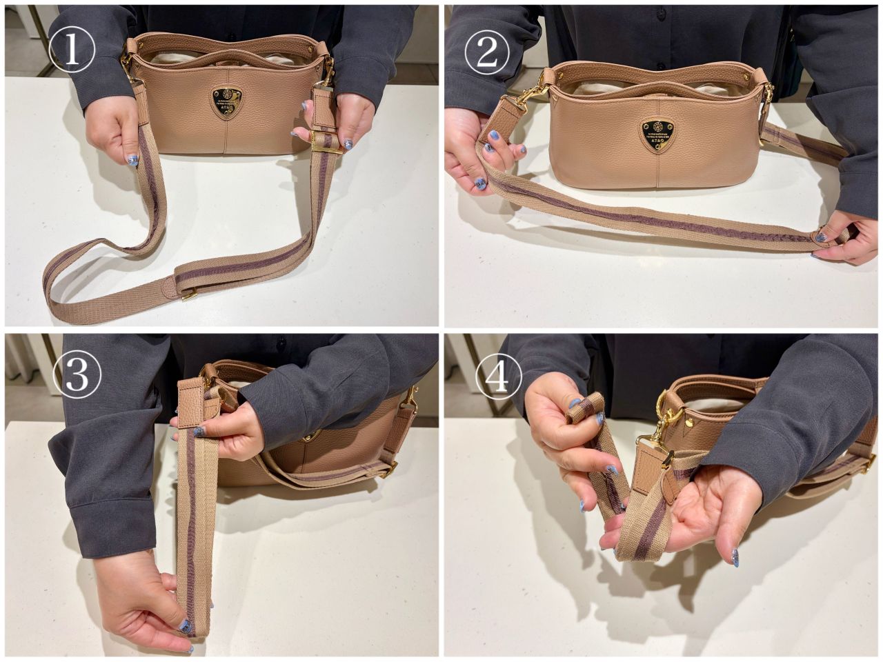 そしてショルダー紐を1か所結んであげると②肩掛けに最適な長さに!