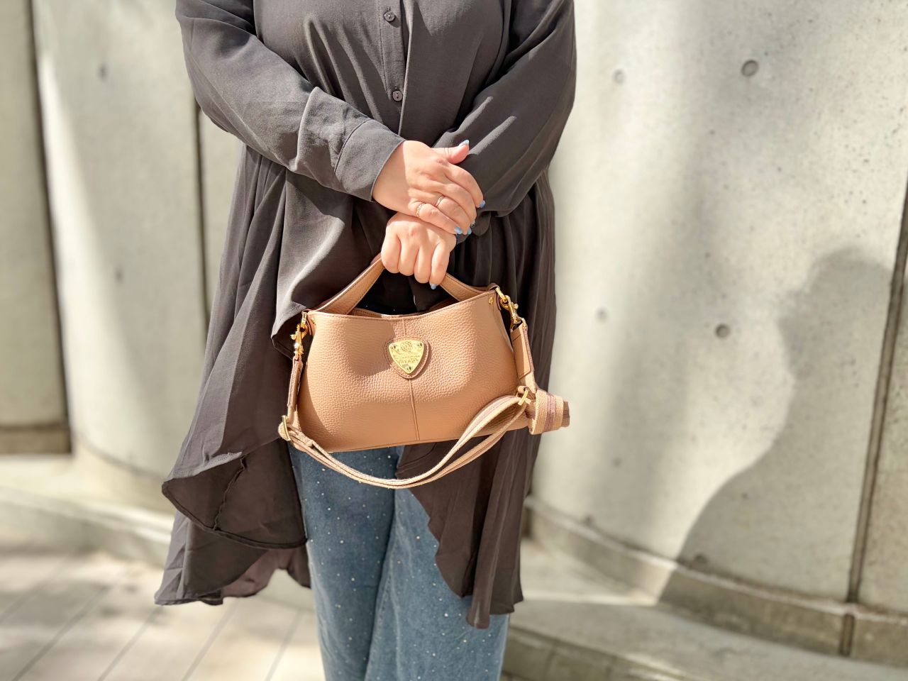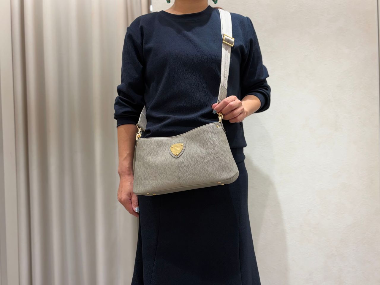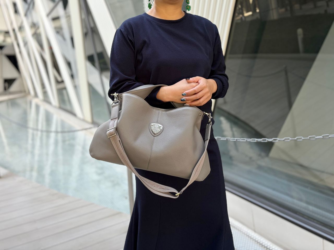 ストーングレーは金具もシルバーなので、辛口でクールな印象になります。
