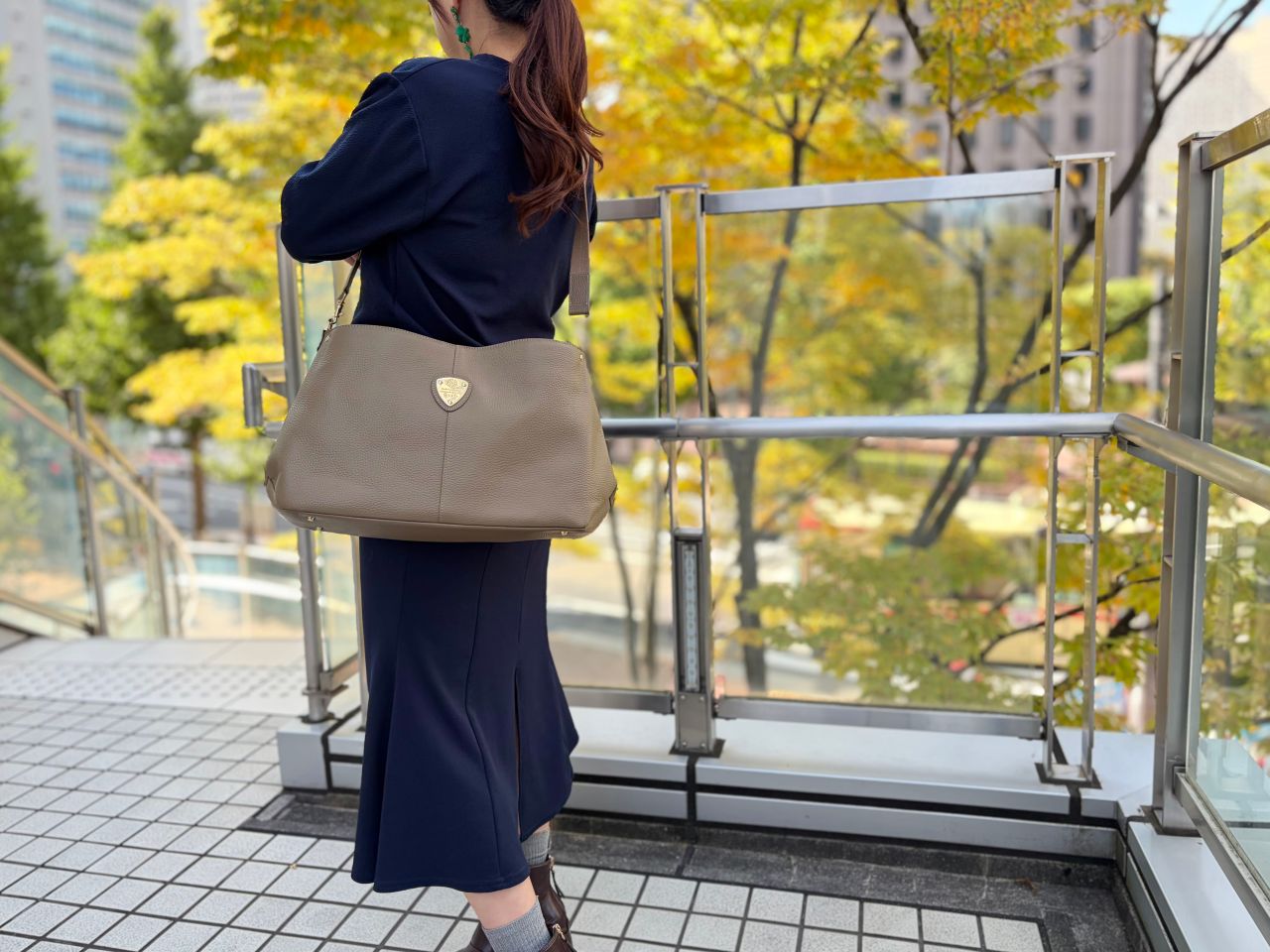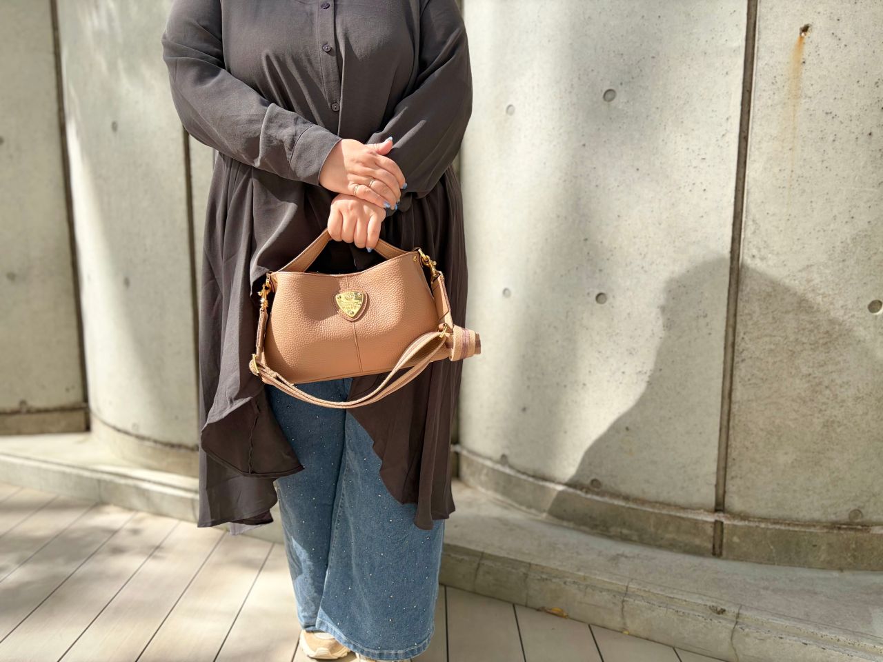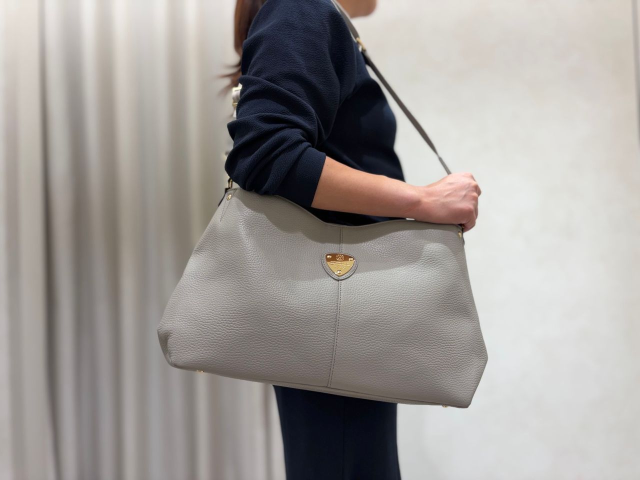 ストーングレーは金具もシルバーなので、辛口でクールな印象になります。