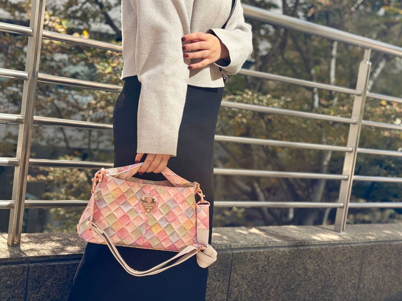 ハンドルが短めなのでショルダー紐を外せばオケージョンバッグに好適なデザインです!