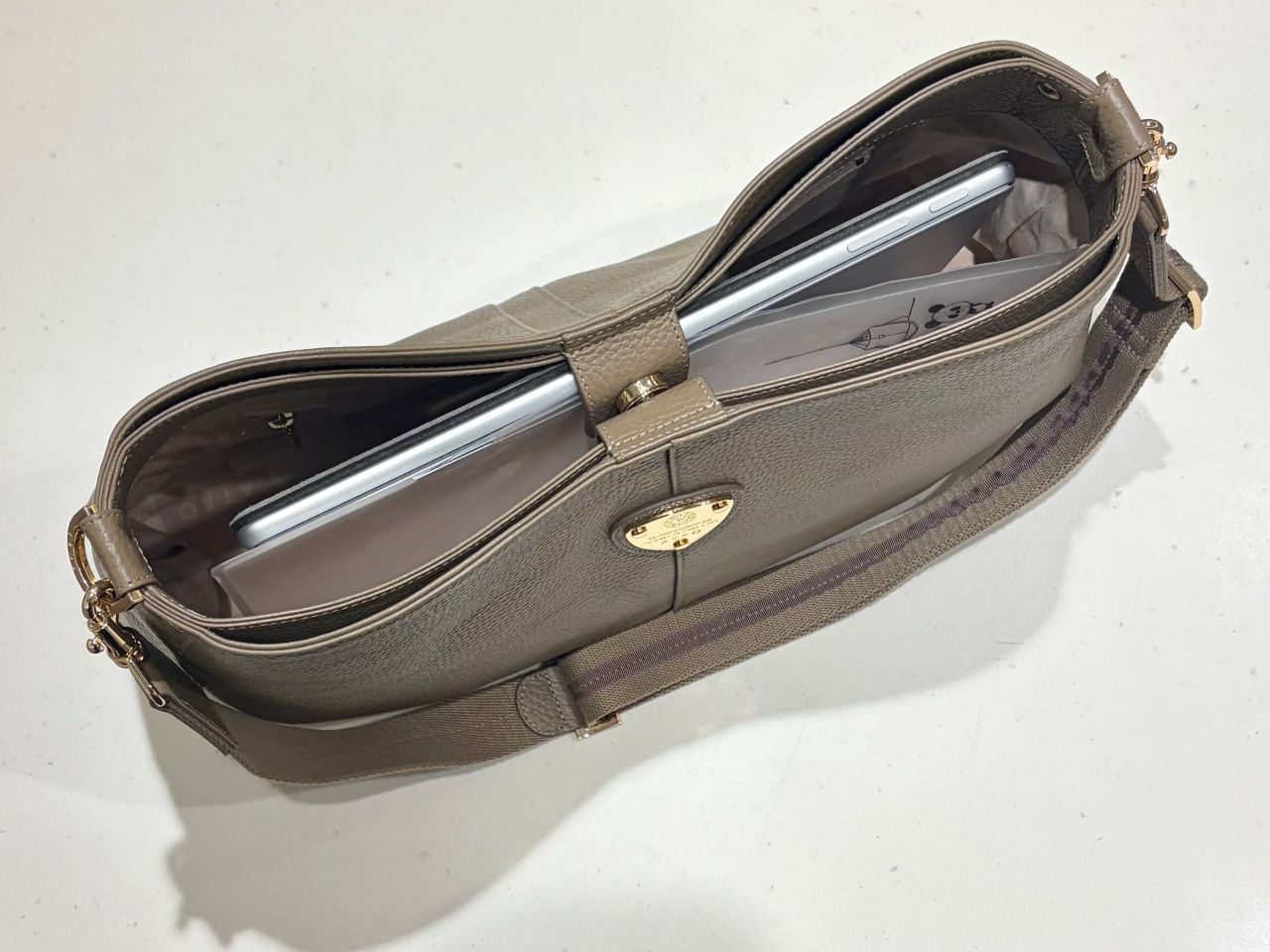 A4やPC入れてみるとこんな感じで、薄いものなら上のスナップは留まります。