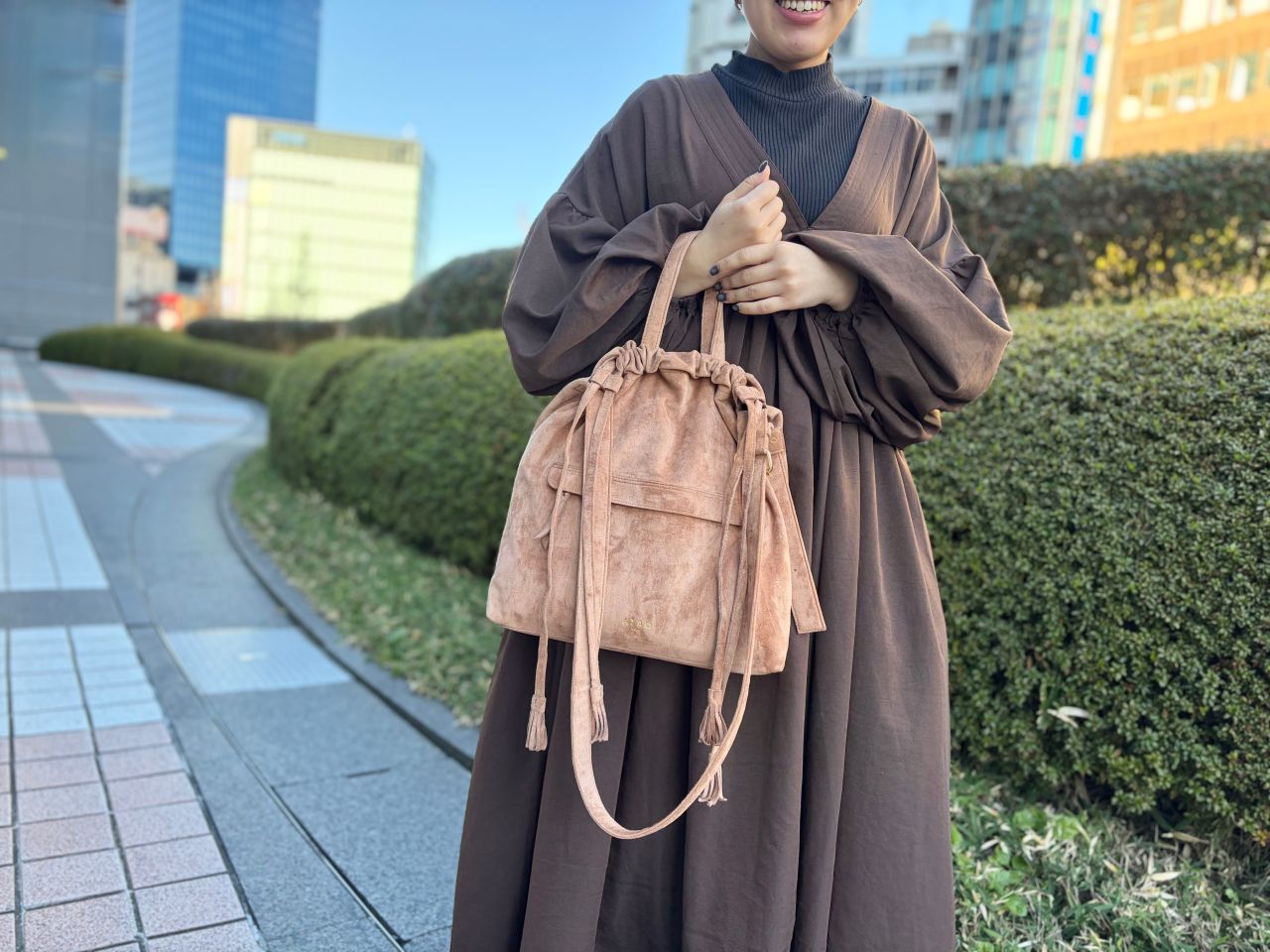 サチ「濃いめのブラウンが今年のトレンドカラーだったのと、ナッツベージュとも迷いつつ自分に合わせてみたら、好きな服のカラーや他に持っているアイテムを考えてやっぱりこっちでした(笑)