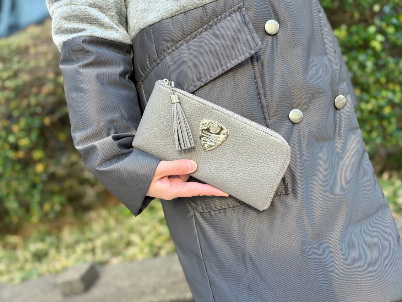 年末年始のお出掛けに、お財布ポシェットでクールなグレーコーデも素敵ですね。