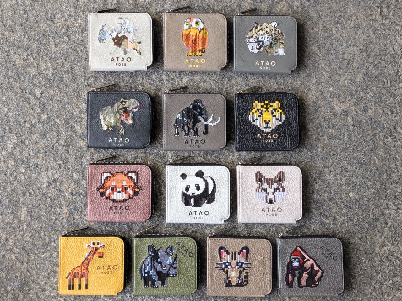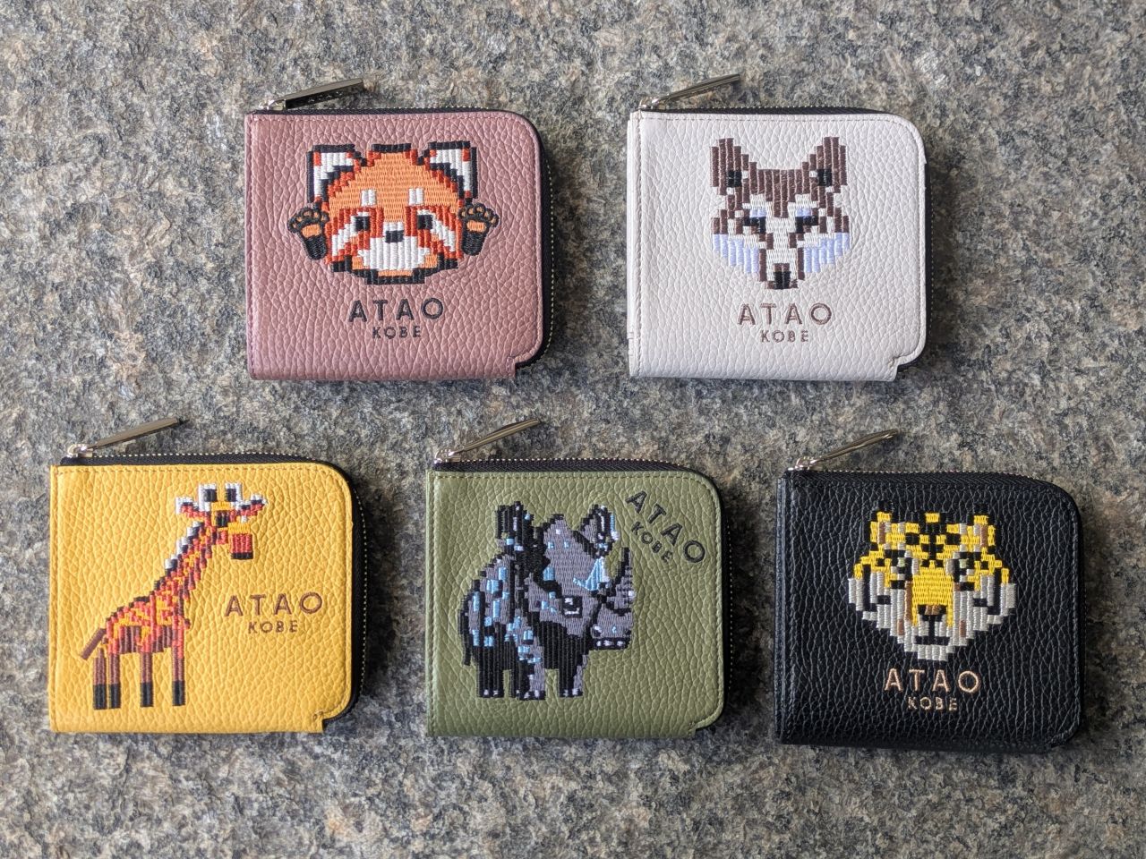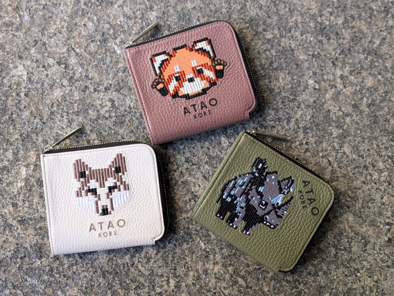 使うごとに光沢が増す撥水レザーにさまざまな動物のピクセルアートの刺繍を施した、かわいさと高級感を両立したデザイン