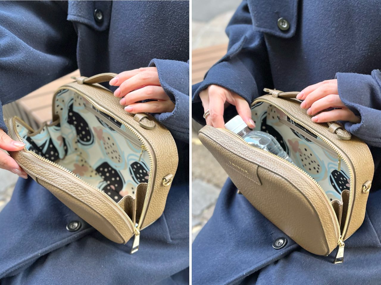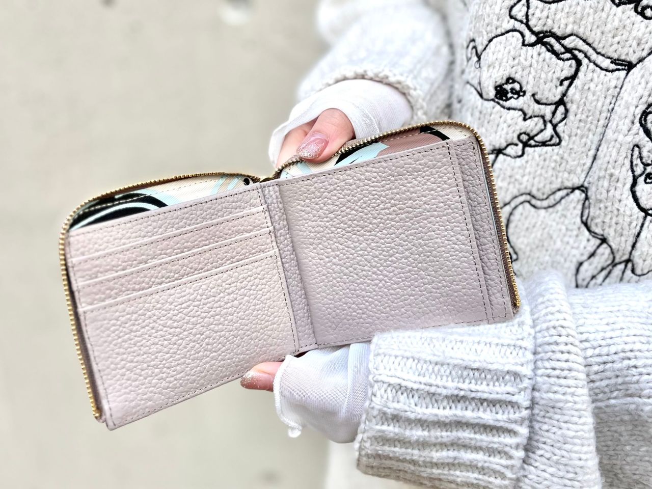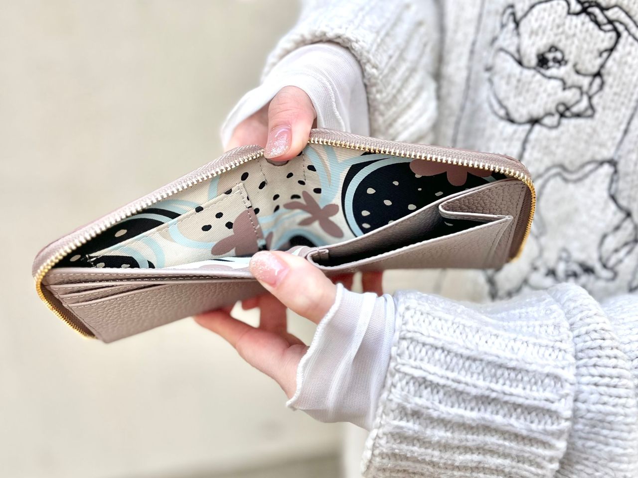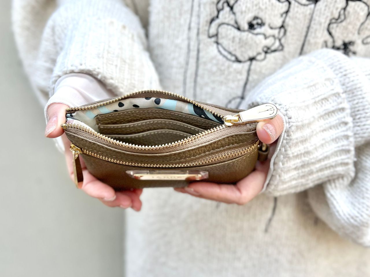 長財布が縦でも横でも入るなど、見た目以上の収納力があります◎(長財布のサイズによっては、縦向きでしか入らない場合もあります。)