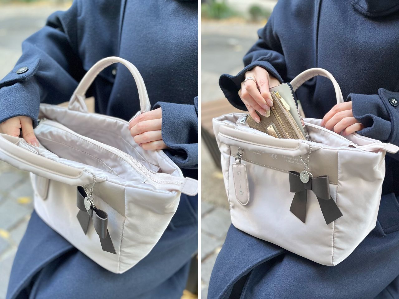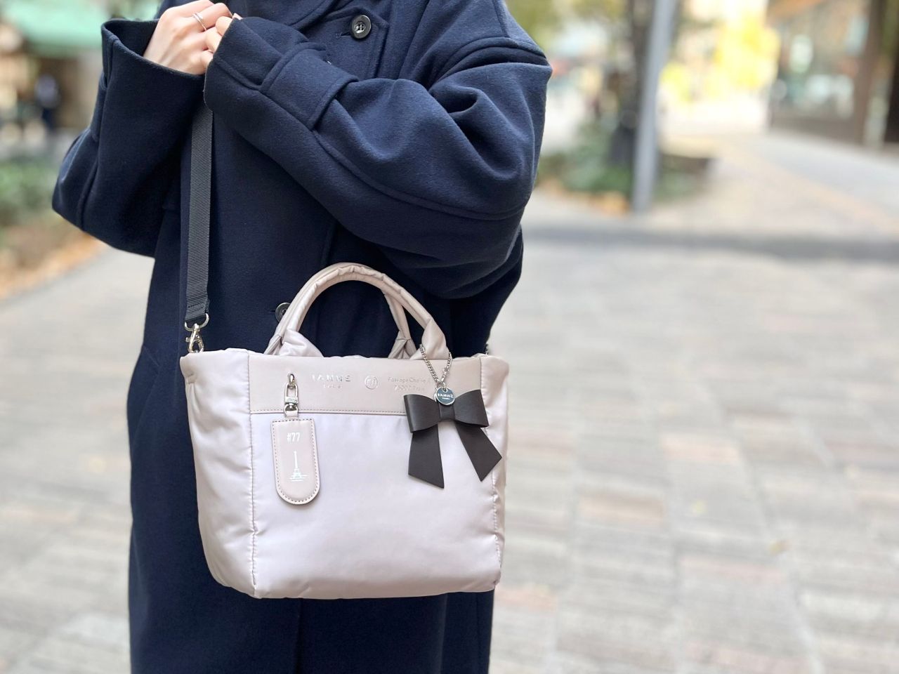 軽量×撥水のパフ素材がデイリー使いしやすい〈オペラ〉と、シンプルなバッグに華を添えてくれる〈リュバン〉のセット。