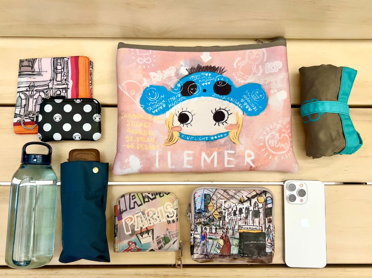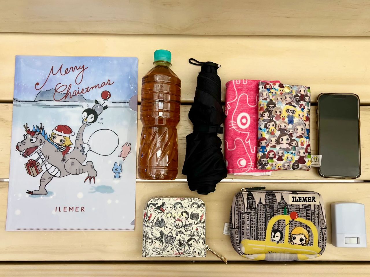 水筒、折り畳み傘、財布、ポーチ、携帯