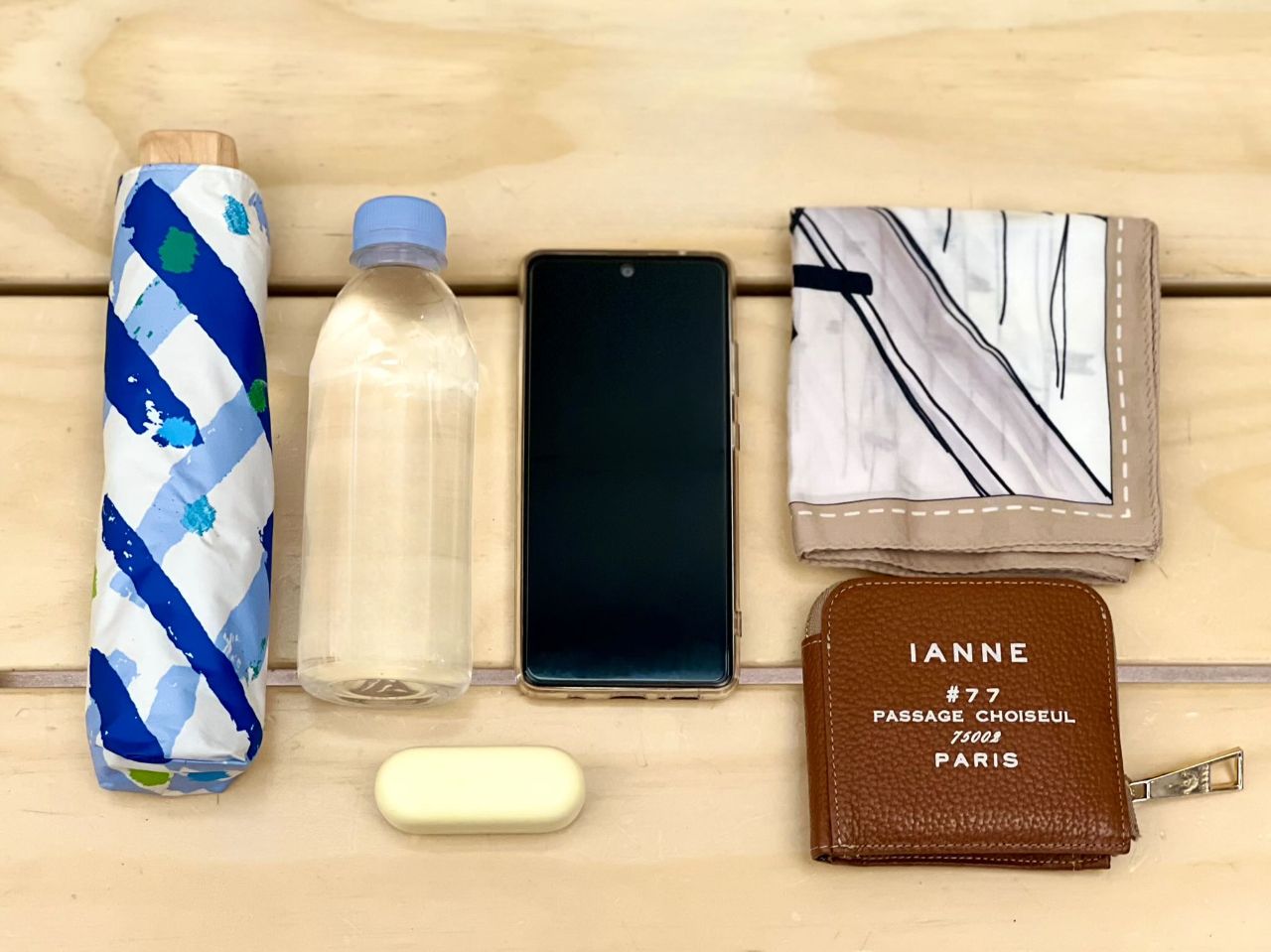 折り畳み傘、ペットボトル330ml、携帯、ハンカチ、財布、ワイヤレスイヤホン