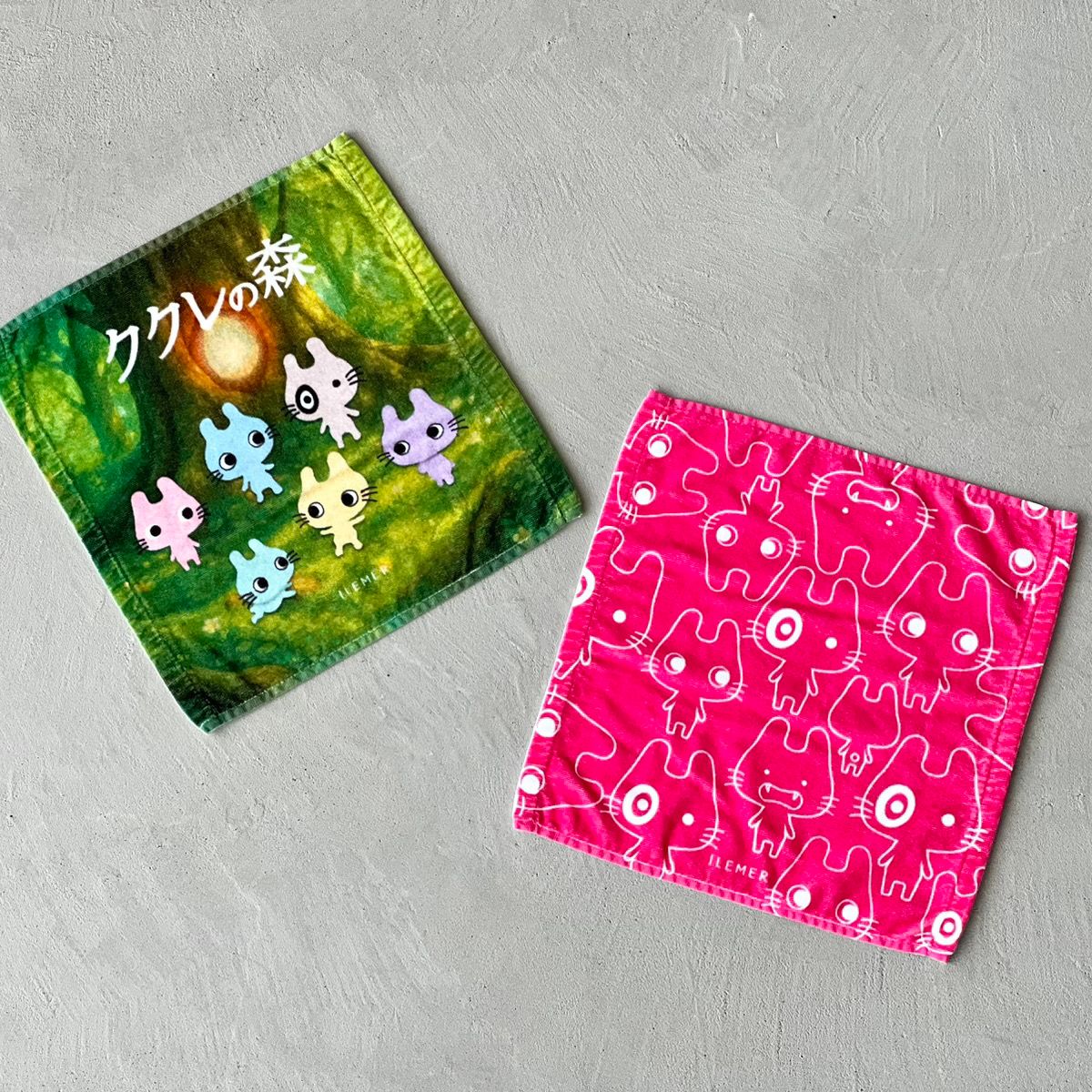 ハンドタオル(右:ククレの森、左:ククレとイーリスたち) 1,200円(税込1,320円)>>【CLICK】