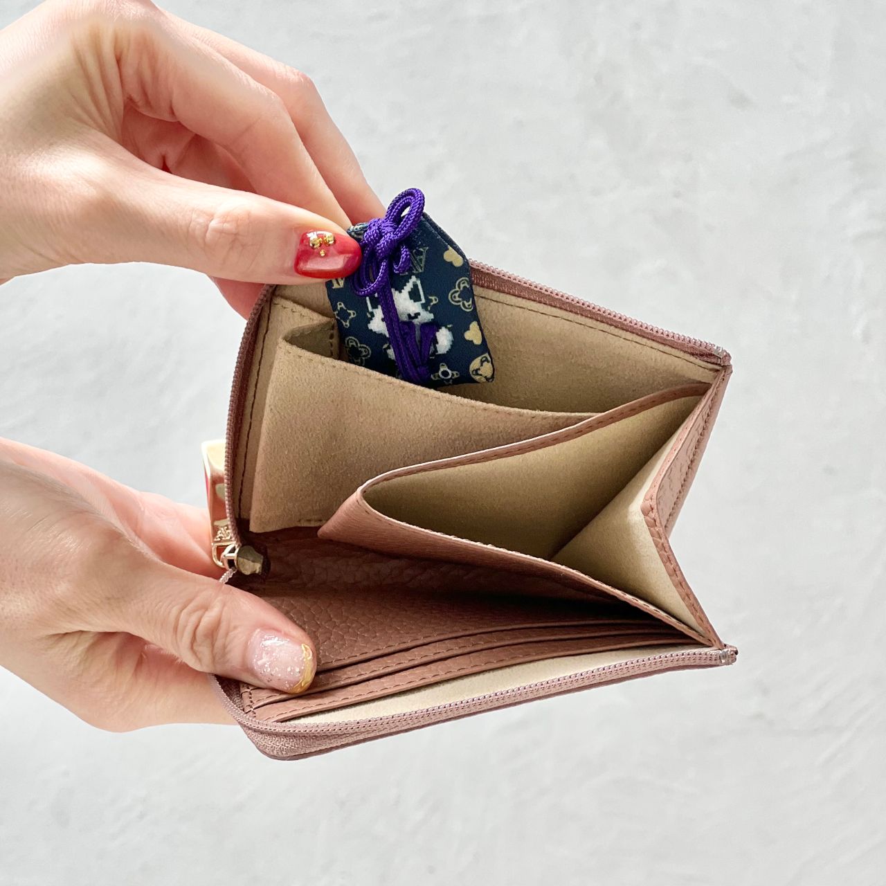 紐はお守りにくるっと一重に巻きつけられる長さでデザインされていますので、画像のように紐をまとめて収納するとミニ財布にもスッキリおさまります♪